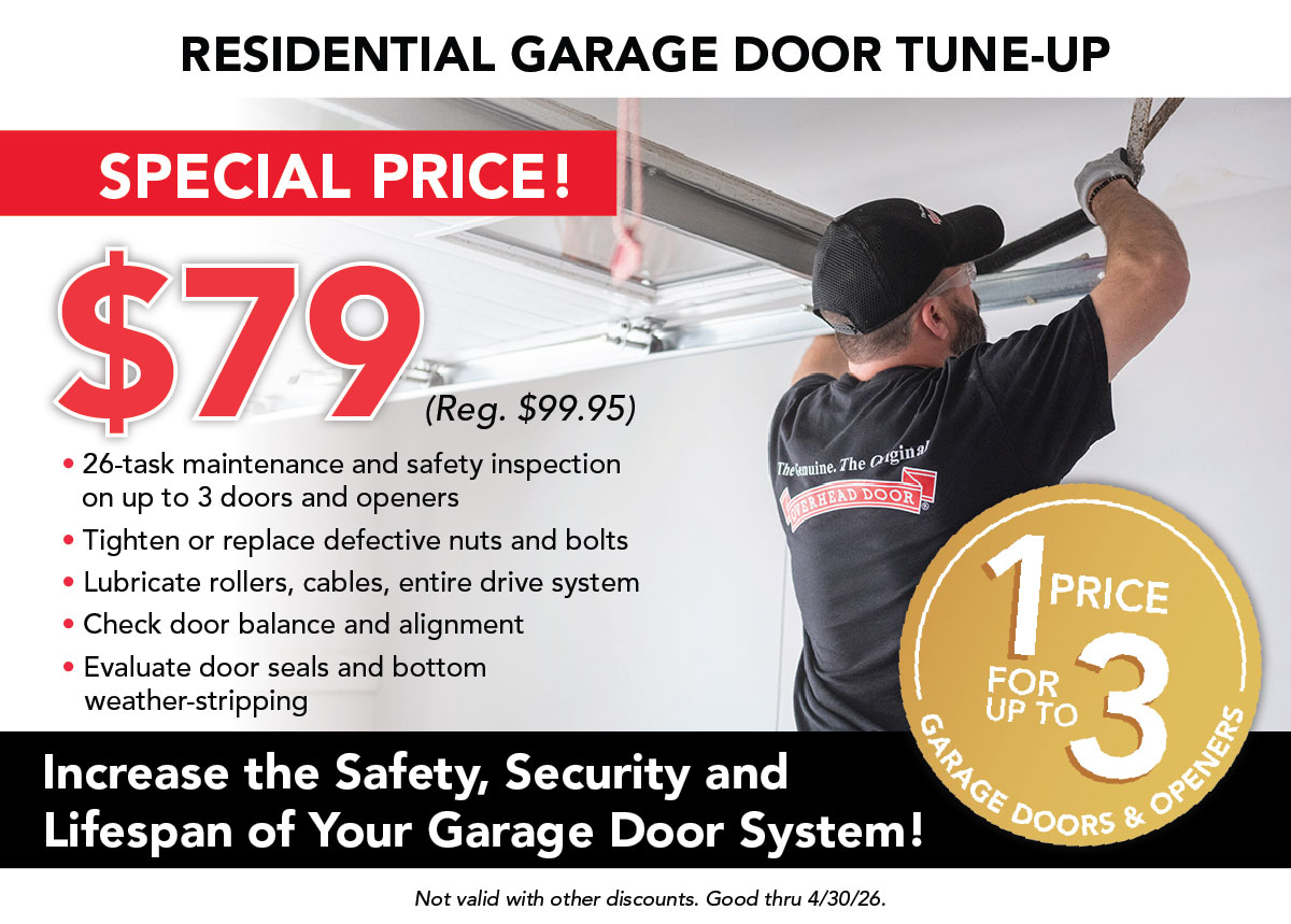 $79 Residential Garage Door Tune-Up. 1 price for up to 3 residential garage doors and openers. APRIL ONLY!! *Not valid with other discounts.